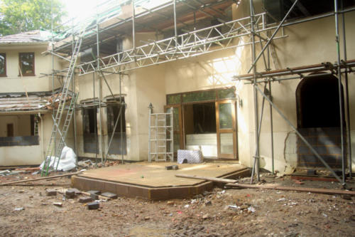 At this stage of the building works, we removed the front fascia of the house to install glass front with balcony. We installed over 140 steel structural support beams to support floors and internal structure / layout. We knocked down walls and re positioned building new walls in place to create new living spaces and reshaped window apertures. The new roof living space is being built above the main structure of house.
