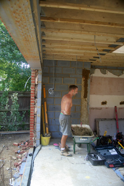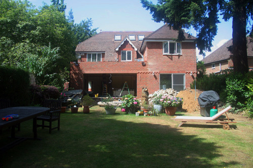 Sunningdale homes are well established, professional house extensions builders in Sunningdale, Berkshire and house builders in Sunningdale Berkshire. We started this ground floor rear extension June 2013. The house extension is to a six bedroom family home in Sunningdale, on the boarder with Chobham in Surrey. Before we could start building we had to knock out the existing structural back walls supporting the rooms upstairs, right above the point of the building extension. A large crane was needed to lift the huge steel structural support beams over the roof of the house to the back garden. The steels were carried into the building, installed in position, bolted together and welded. The house extension is a large ground floor extension to accommodate a new kitchen... come dinner and family entertainment - living space, with sliding bi-fold doors looking out into the garden. The extension has a flat roof with a sky lantern, centre of the room for additional natural light. To the side, at the front of the house is a small single storey house extension with a pitched tiled roof. The extension enlarges the existing utility room and has access to back garden. The house extension building is scheduled to complete end of August 2013. By the end of July 2013 the structure of the house extension is built and all the electrical and plumbing services are going in. Once this work is done we can begin to prepare the area for plasterboard and plastering, floor screeding and flooring and all the cosmetic finishes. The whole extension build, both inside and outside was completed to a very high standard which, is just how we like it ! kitchen supplied and fitted by Orchard kitchens in Egham, Surrey. House extension builders in Sunninghill and Sunningdale Berks and Builders in Sunningdale Berkshire